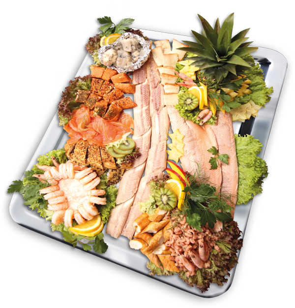 Individuell nach Ihren Wünschen fertigen wir erstklassige Fischplatten in verschiedenen Größen und Belägen. Zusätzlich erhalten Sie kostenlos anbei Kräutersoßen aus eigener Herstellung und Sahne-Meerrettich.